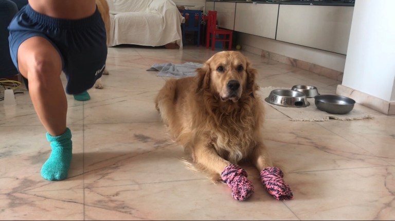 I love to workout at home and my favorite part is when my dogs join me when I do my exercises.