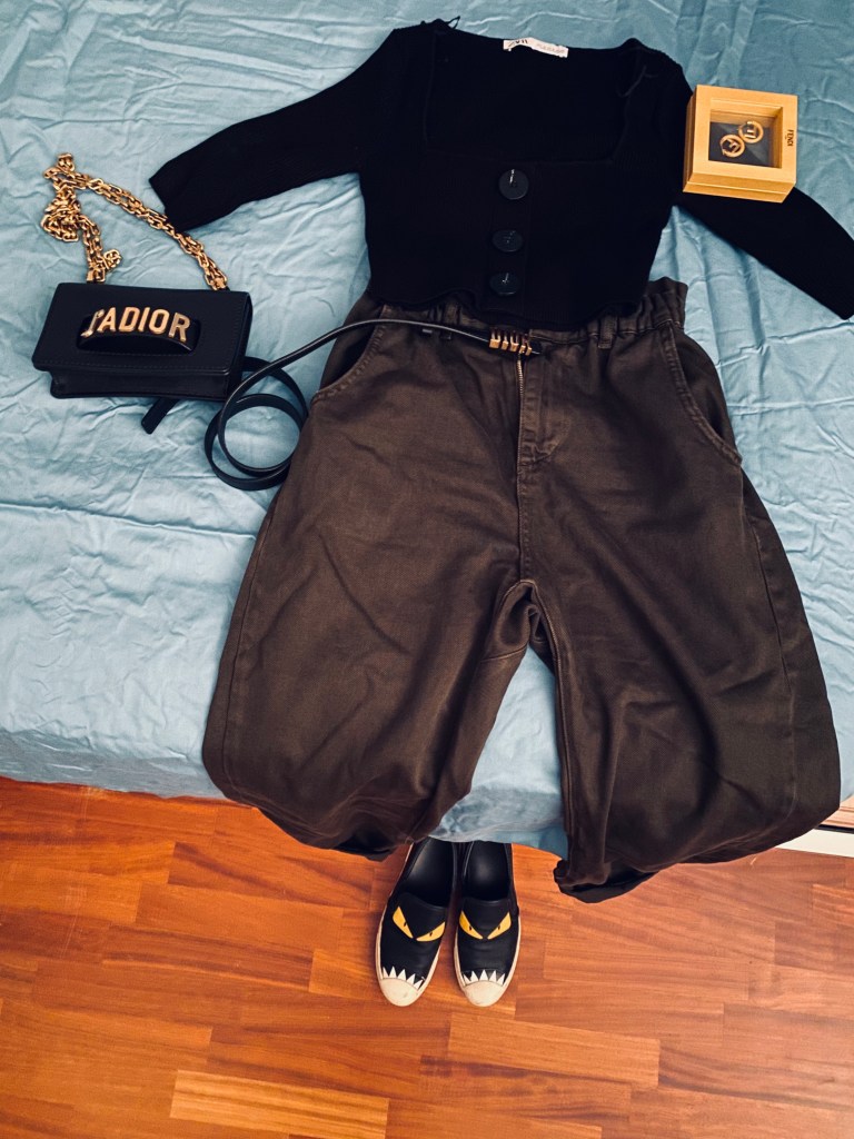 Today my outfit is composed by dark green jeans and black top by Zara, belt and bag by Dior, earrings and shoes by Fendi.